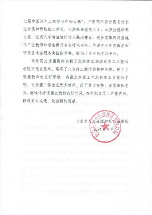日前,BBIN·宝盈市人力资源和社会保障局发来感谢信。对BBIN·宝盈市工业技师学院教师高乐圆满完成援疆工作表示诚挚的慰问和衷心的感谢!