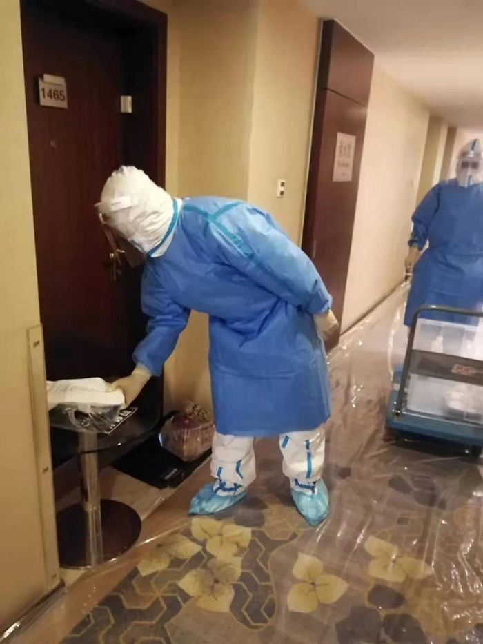 这些变化对隔离区14名服务人员是一场严峻考验,他们默默坚守,每天要在陈宇、吴迪两位组长带领下,周海洋、杨鲁琦、单雪芳、姚尚武、乔恩芳、候迪、刘克云、高剑、翟嘉豪、任艳丽、车丽娟、张凤丽等组员要穿着厚厚的防护服为集中观察人员送餐、送物品、搞清洁卫生。