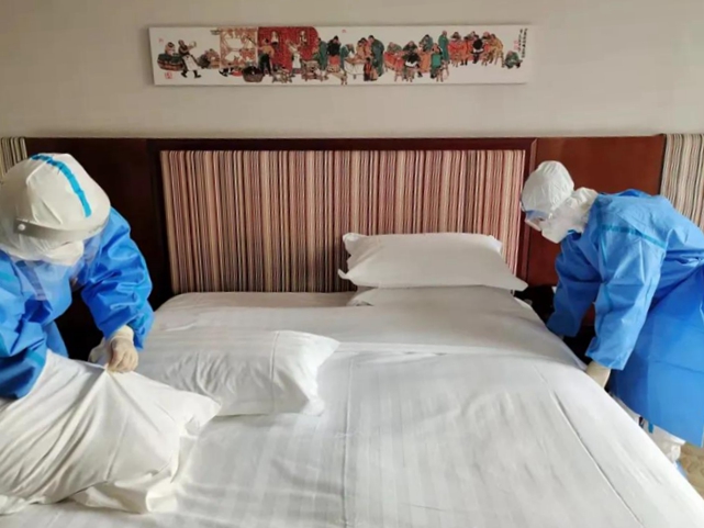 酒店第一时间成立防疫领导小组,在领导小组正副组长王强、郑冰、白江指挥调度下,各项准备工作有条不紊地进行:对酒店进行分区管理,将酒店整体划分为生活区、缓冲区和隔离区,并按照相应区域,张贴了相应颜色标识,明确要求各区人员只允许在本区域内活动,严禁跨区工作、串区走动;酒店负责人白江带领美居酒店指挥部成员开展员工培训、物资准备工作。物资准备是个细活儿,要为客人准备足够14天用的各类物品用品,包括大量洗漱用品、足量的饮用水、体温计等;针对餐食卫生、病毒消杀、客房服务、垃圾清运等各方面工作制定明确的工作方案;要求领导小组人员要24小时轮岗值班,党员和骨干带头坚守岗位,直至完成隔离观察任务。