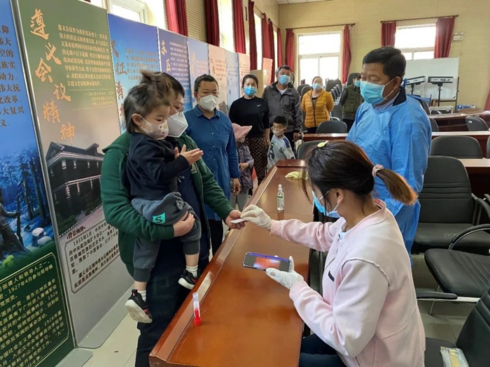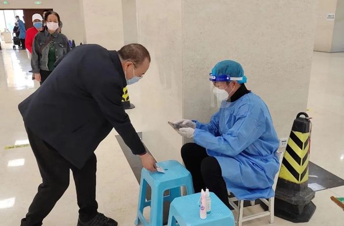 曾担任过第一书记的共产党员王唯良在BBIN·宝盈新天地社区进行核酸检测队伍疏导或信息录入工作。