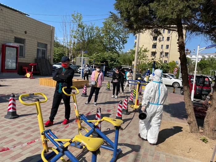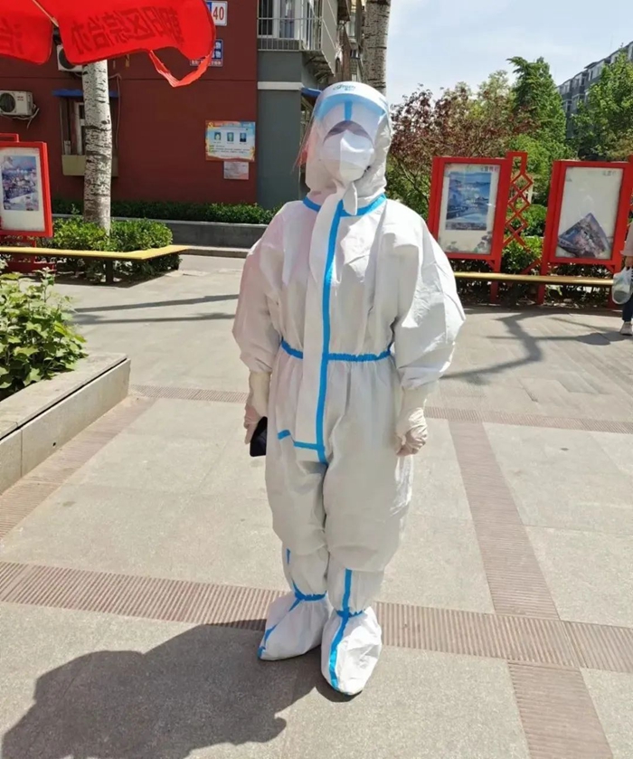 共产党员单安琪在通州区翠景北里社区参加入户调查和消杀工作。