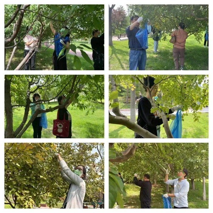 此次活动内容为树木疏果,顾名思义,疏果就是疏除多余的果实,最大限度减少树体的无效养分消耗,集中营养。通过疏果,可调节树体健壮。工作内容虽然简单,但大家仍然认真聆听公园工作人员对此次活动内容的讲解,丝毫没有怠慢的想法。活动中大家热情高涨,自动分组,有人负责海棠树有人负责桃树,一切井然有序。