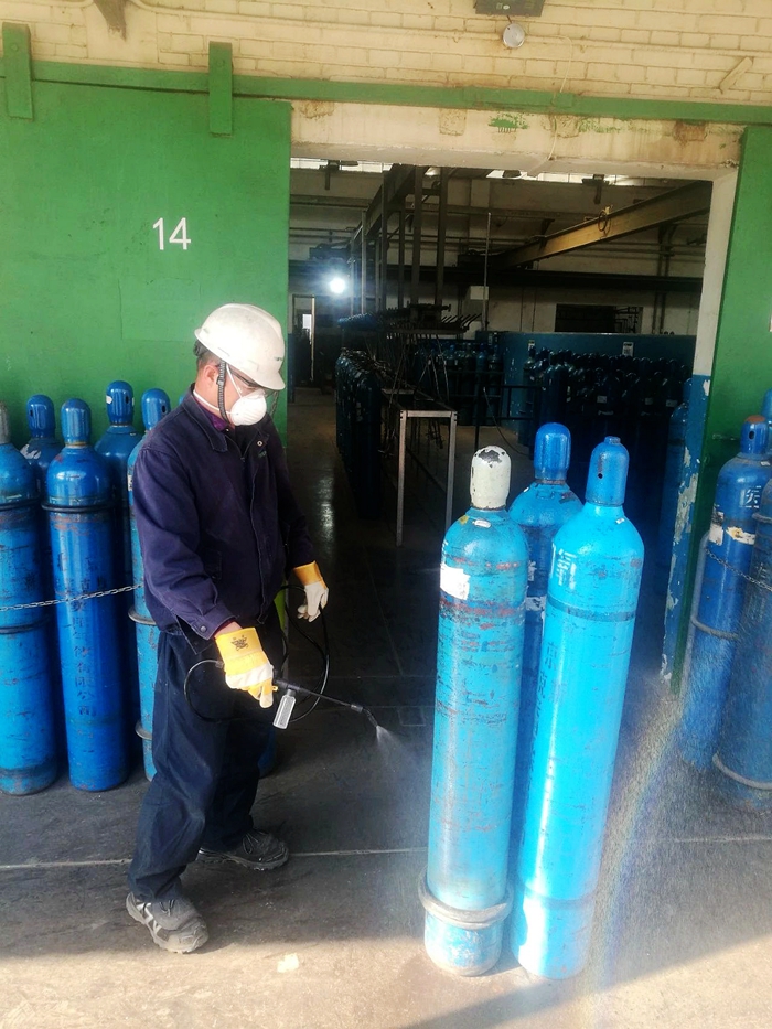 疫情大大增加了配送工作难度,配送员要全副武装,穿上防护服、戴上防护镜和防护口罩。每次配送前后,都要分别在公司和医院对氧气钢瓶和车辆进行消毒处理,以确保医用氧在生产、运输过程中始终处于绝对安全状态。