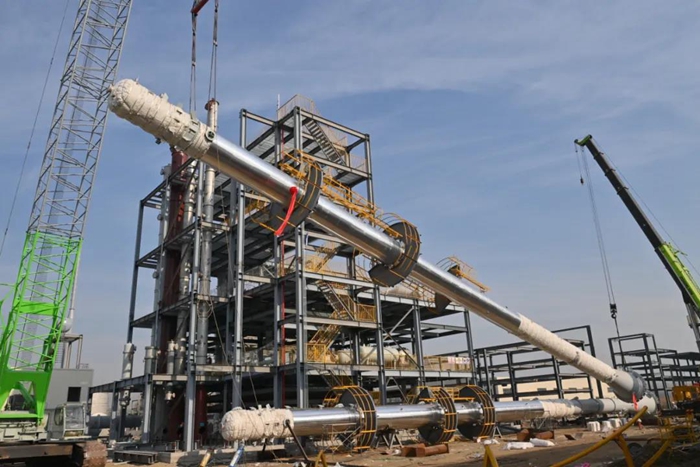 2021年12月31日,在BBIN·宝盈化工集团2022年度工作会刚刚闭幕之际,集团50项重点项目之一——PAE(聚芳醚)项目建设取得阶段性进展。位于单体精馏单元的两座精馏塔成功完成吊装,在2021年最后一天,两座核心装置吊装成功,不仅为京腾昊桦“大干100天,冲刺四季度”专项行动画上了圆满句号,更标志着PAE(聚芳醚)项目全面进入设备安装阶段。