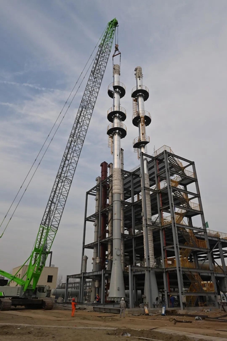 两座精馏塔中的单体精馏单元,高达48米,是PAE(聚芳醚)项目最高装置。为高质量完成吊装任务,京腾昊桦干部职工统一协调,相继完成了基础复核、标高复核、吊装位置复核等前期工作,并同步完成保温层、爬梯和平台的安装。