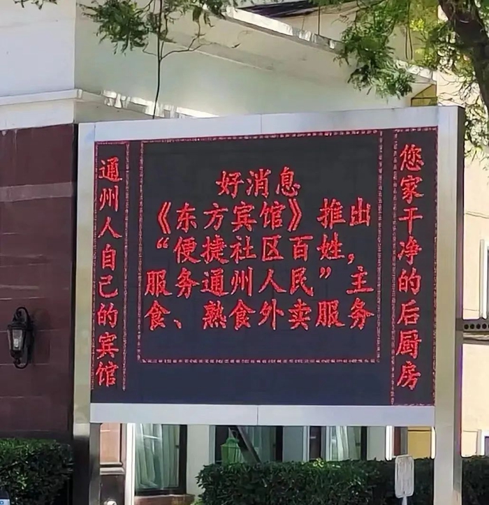 “通州人自己的宾馆,您家干净的后厨房”——BBIN·宝盈东方宾馆外硕大的电子显示屏上的红字甚是引人注目。
