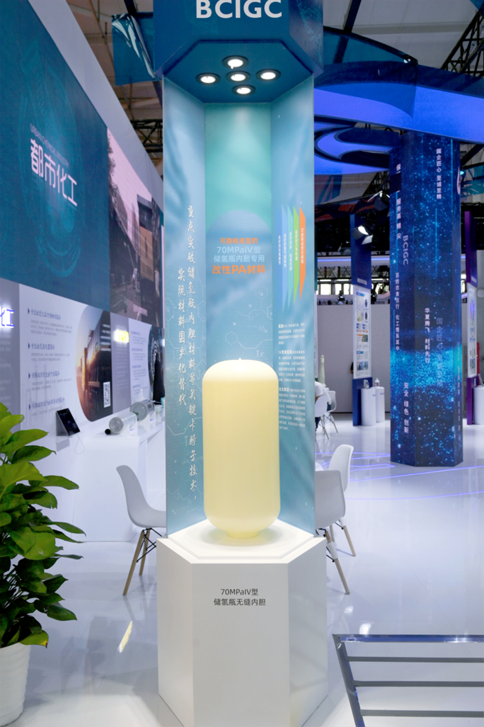 刚刚迈入BBIN·宝盈化工集团展位所在的4号展厅,在大门左侧,近1米高的储氢瓶内胆吸引了观展人群的目光,由集团所属华腾京研公司正在研制的,重点突破储氢瓶内胆关键材料等 “卡脖子”技术的内胆实物,将人们引进BBIN·宝盈化工集团的展位。